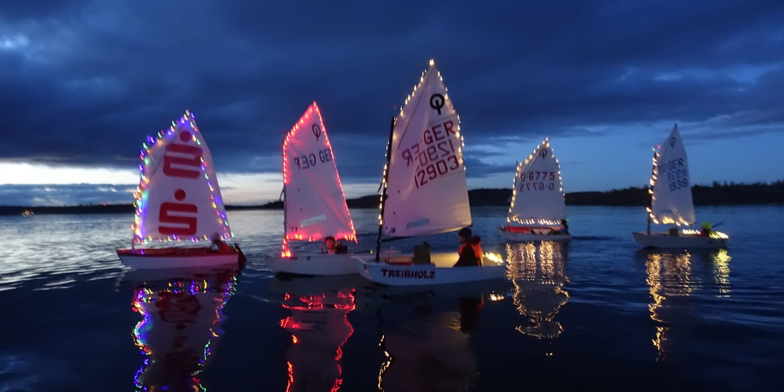 Doch auch im Vereinsleben tat sich noch so Einiges, bevor nun langsam der Winter an die Tür klopft und der See zur Ruhe kommt. So beendeten unsere jüngsten Segler, die Opti-Kids, ihr Jahr auf dem Wasser wieder mit dem Mondscheinsegeln. Bunt geschmückt mit Lichterketten ging es bei einsetzender Dämmerung und wenig Wind auf den See. Und sogar der namensgebende Mond ließ sich noch blicken.